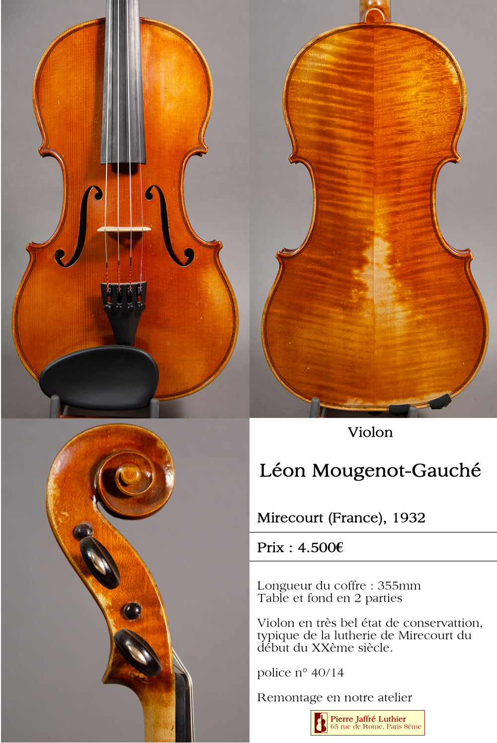 Violon en très bel état de conservation, typique de la lutherie de Mirecourt du début du XXème siècle.
