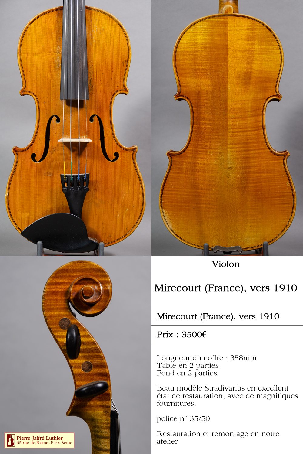 Beau modèle Stradivarius en excellent état de restauration, avec de magnifiques fournitures.