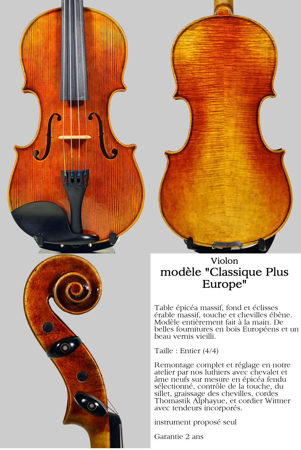 Remontage complet et réglage en notre atelier par nos luthiers avec chevalet et âme neufs sur mesure en épicéa fendu sélectionné, contrôle de la touche, du sillet, graissage des chevilles, cordes Thomastik Alphayue, et cordier Wittner avec tendeurs incorporés.